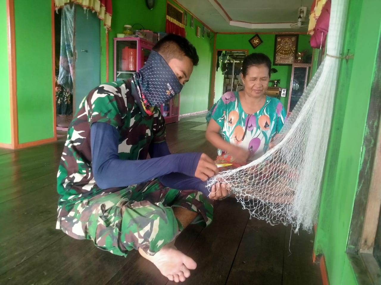 Berada rumah Ibu Yana (37) seorang ibu warga Desa Sarang Burung, Serda Nurhidayatulloh melaksanakan Komunikasi sosial juga belajar proses pengayaman hingga menghasilkan sebuah kerajinan tangan tradisional.