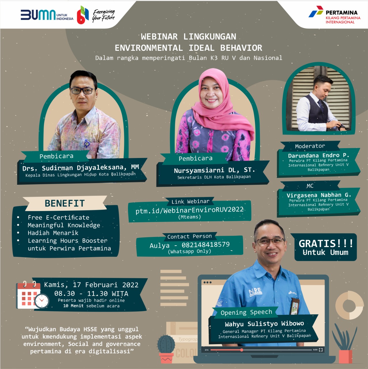 “Webinar ini merupakan rangkaian dari peringatan bulan K3 tahun ini di RU Unit Balikpapan. Tema yang diambil Environmental Ideal Behavior. Webinar akan dilaksanakan tanggal 17 Februari besok,” ujarnya