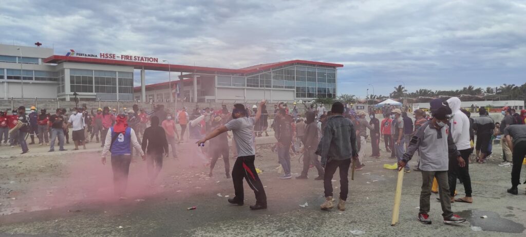 Massa yang awalnya datang memprotes kebijakan managemen Pertamina yang menutup jalan karena adanya insiden kebakaran kilang. Massa tidak Terima karena merasa penutupan jalan merugikan ekonomi warga. Disamping itu ekses kebakaran menyebabkan warga harus menghirup polusi udara.