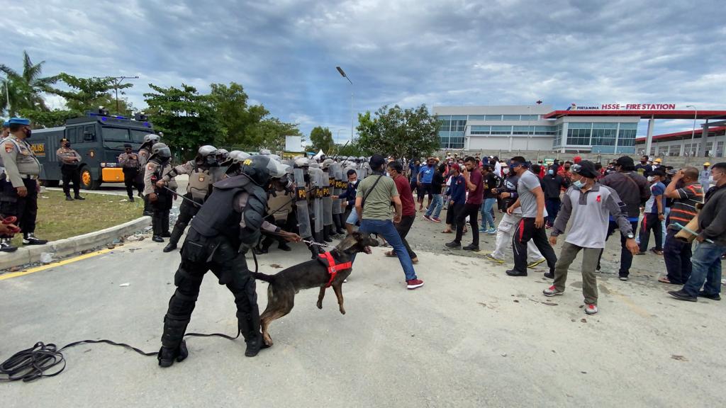 Hal ini pun mendapat respon dari pihak Kepolisian yang sudah menyiapkan personelnya ditambah dengan kendaraan taktis water cannon dan dua anjing K9. Adanya hadangan dari aparat keamanan membuat warga yang berdemo yang awalnya hanya sebatas orasi mulai memanas bahkan mereka berani dan nekat mencoba menerobos palang pintu pasukan keamanan.