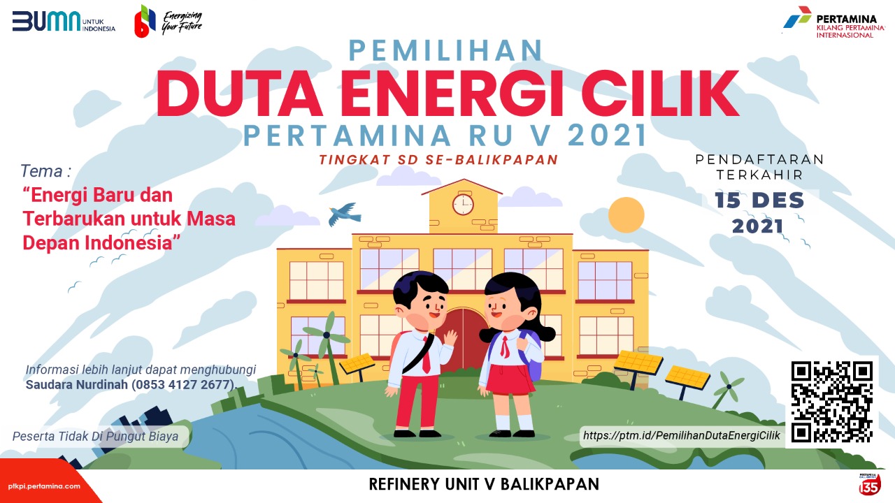 “Kegiatan yang akan dilaksanakan adalah kompetisi Pemilihan Duta Energi Cilik. Kompetisi ini merupakan salah satu bentuk edukasi yang dilakukan Pertamina untuk mengajarkan kepada generasi muda khususnya pelajar untuk mengenal apa itu energi sehingga tumbuh rasa peduli dalam untuk berhemat dalam menggunakan energi dalam kehidupan sehari-hari,” ujar Area Manager Communication, Relations & CSR PT Kilang Pertamina Internasional Unit Balikpapan Ely Chandra Peranginangin, Kamis, (9/12/2021).