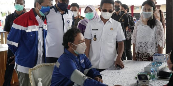 Kegiatan ditinjau tim satgas kota dan wali kota yang berkesempatan melihat langsung dan berdialog managemen Pertamina dan menyapa peserta vaksin.