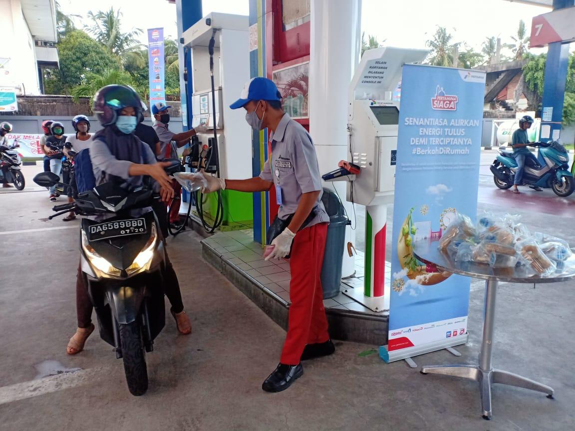 Takjil akan dibagikan oleh operator dan staf SPBU dimulai pada pukul 17.00 hingga selesai dengan dilengkapi dengan masker dan sarung tangan sebagai bentuk pencegahan penyebaran Covid-19.