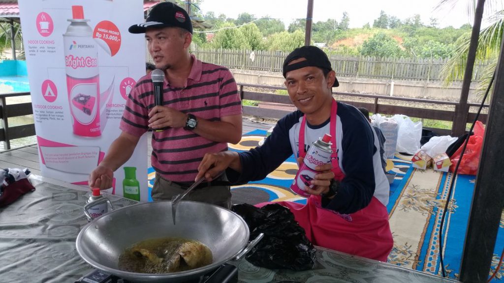 Region Manager Communication and CSR Pertamina Kalimantan Yudi Nugraha (kiri)saat demo menggoreng ikan menggunakan bahan bakar bright gas camp didampingi Hilman Jurnalis BKV.