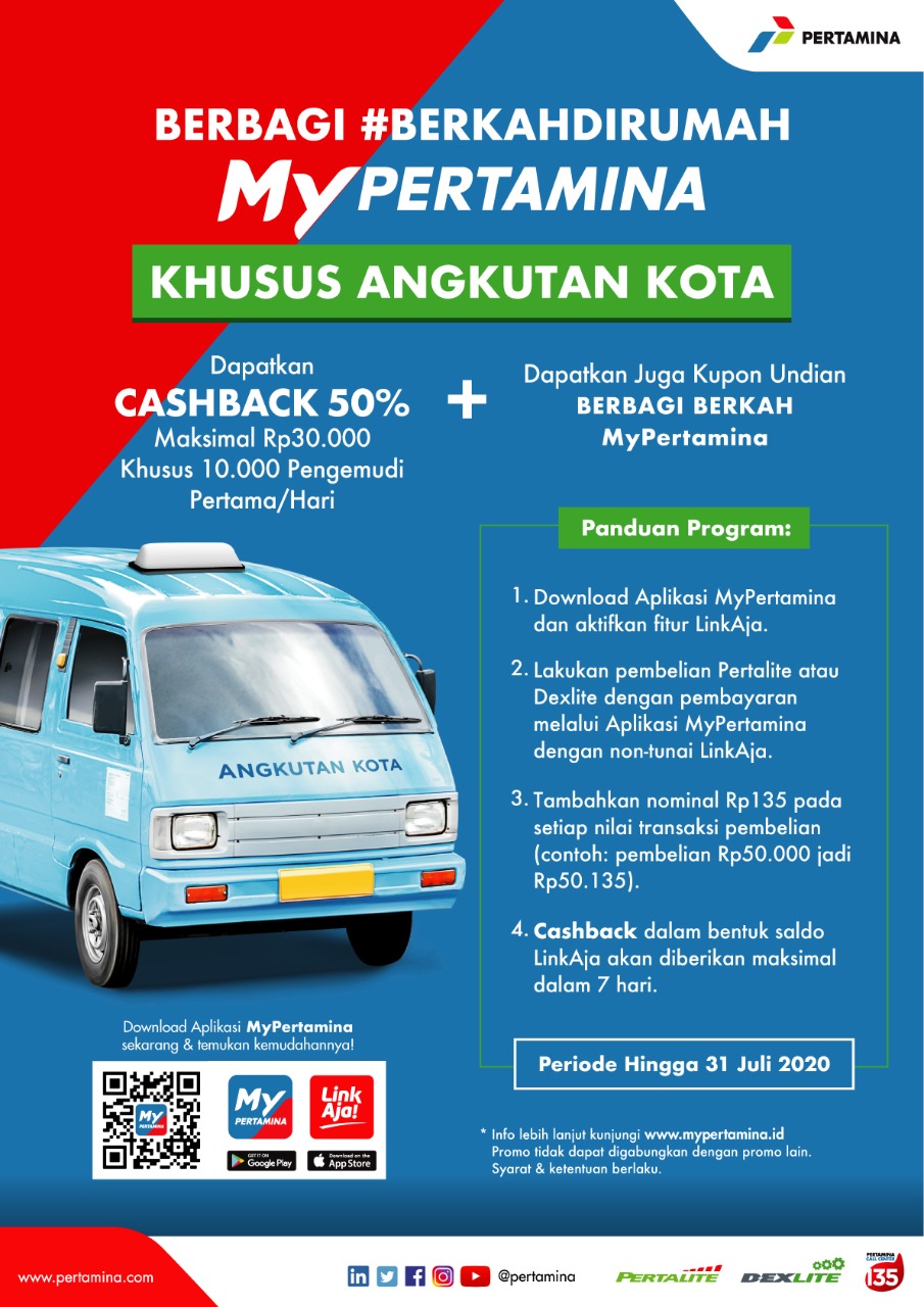 Cashback berlaku untuk 1 kali transaksi per hari dan program ini tidak dapat digabungkan dengan program promosi lainnya, namun semua pengemudi angkot yang bertransaksi dengan MyPertamina tetap mendapatkan kupon untuk mengikuti undian Berbagi Berkah MyPertamina 2020.