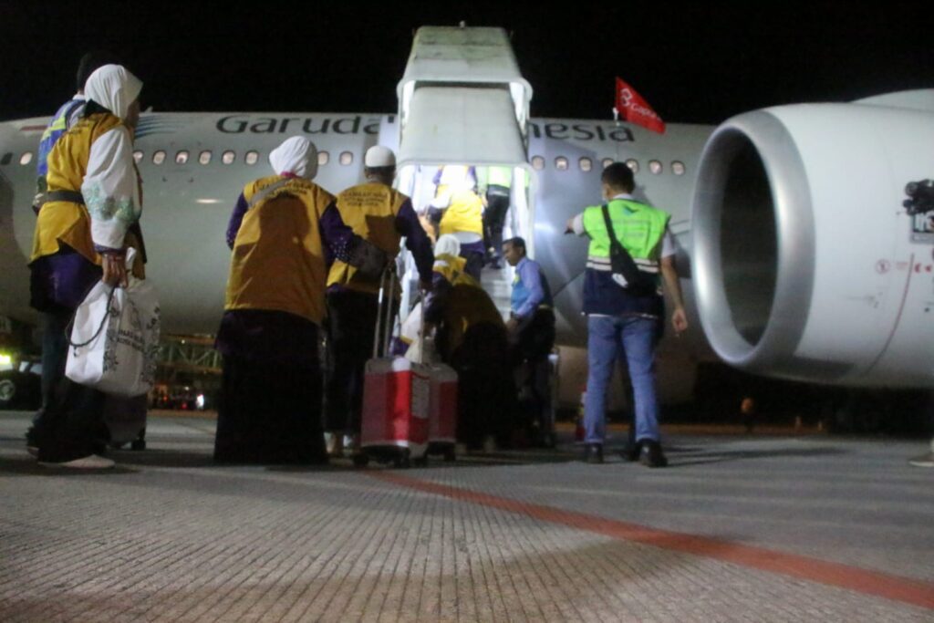 Jemaah baru diterbangkan sekitar pukul 03.49 wita dengan pesawat Garuda Indonesia.