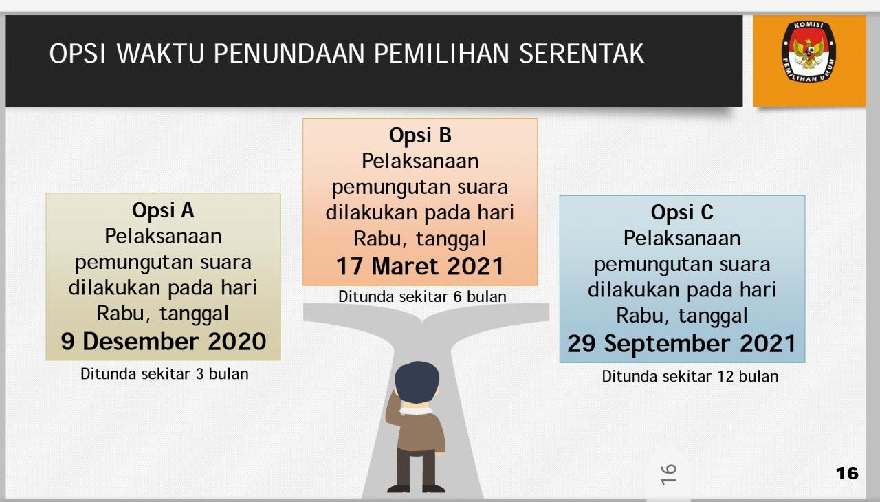 Bahkan Noor Thoha menyampaikan tiga opsi waktu pencoblosan pilkada serentak yakni akhir tahun 2020 atau Maret 2021 dan September 2021.