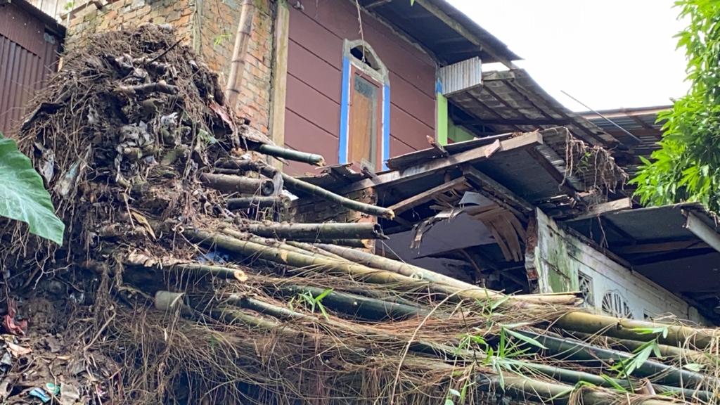 Pohon tumbang itu juga menimpa atap dan belakang rumah Abdul Haris hingga terlihat hancur. Muslimin warga sekitar menyatakan, kejadiannya begitu cepat, pada Selasa kemarin.