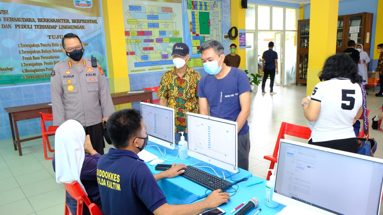 Balikpapan, Inibalikpapan.com – Kabid Humas Polda Kaltim Kombes Pol Yusuf Sutejo, S.I.K., M.T., meninjau salah satu gerai vaksin Presisi yang terletak di SMP Katolik Santo Mikail, Jl. Kompleks Pu No.61 Kelurahan Telaga Sari, Balikpapan, Sabtu (28/08/2021).