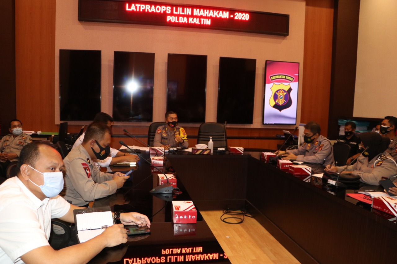 Balikpapan- Dalam rangka pengamanan libur Natal 2020 dan Tahun Baru 2021, Polda Kaltim menggelar Latpraops Lilin Mahakam 2020 di Ruang Posko Digital, Kamis (17/12/2020).