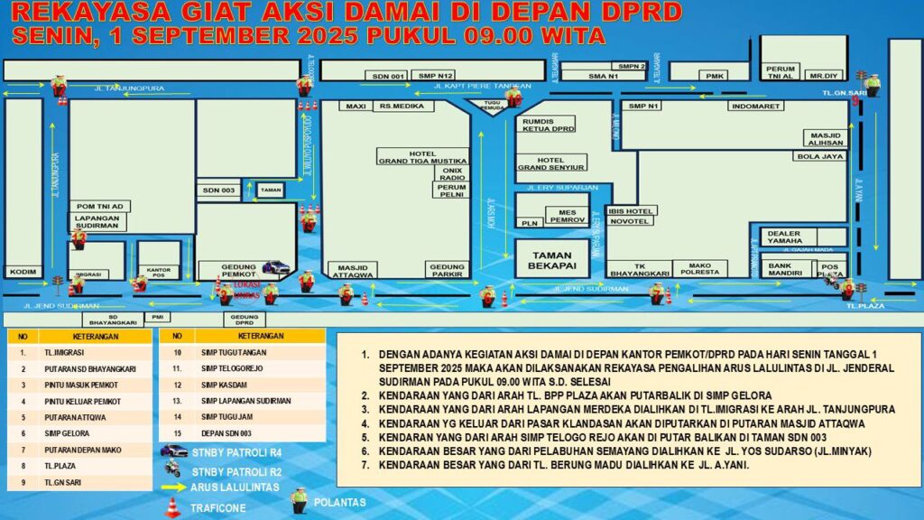 BALIKPAPAN,Inibalikpapan.com – Polresta Balikpapan akan melakukan rekayasa arus lalu lintas sehubungan dengan adanya kegiatan aksi damai yang digelar di depan Gedung DPRD dan Kantor Pemkot Balikpapan pada Senin (1/9/2025) pukul 09.00 WITA.