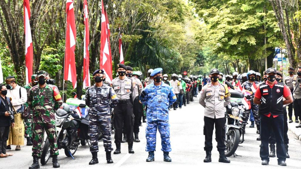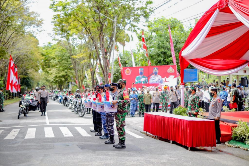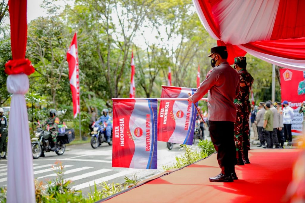 Dalam kesempatan itu, Panglima TNI dan Kapolri melepas personil TNI dan Polisi yang membagikan bansos berupa sembako bagi warga yang terdampak dan menjalani isoman. Bansos tersebut diantar langsung oleh personil TNI dan Polisi dan ojol ke rumah warga.