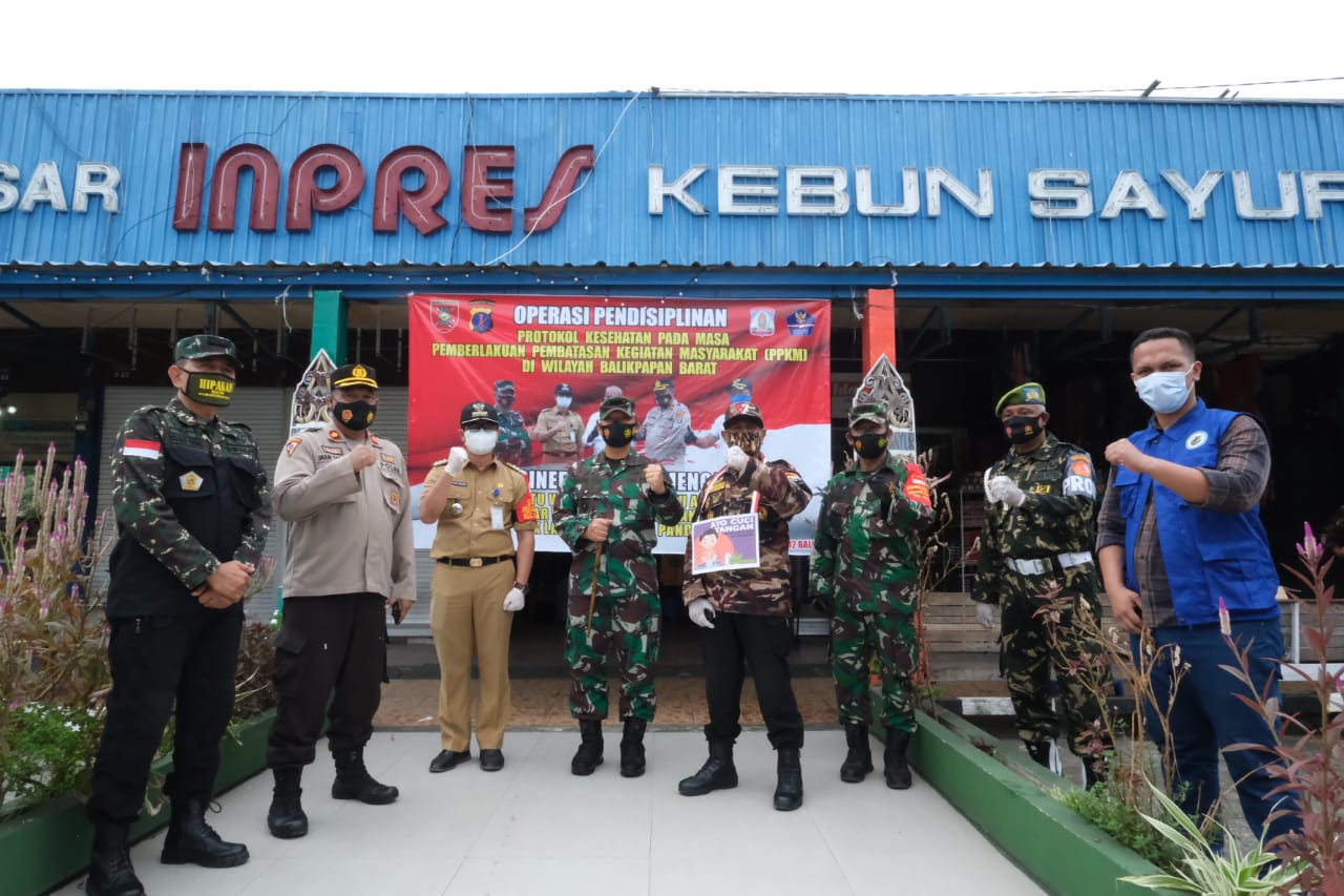 Satgas Penanganan Covid-19 Kota Balikpapan saat melakukan penegakkan disiplin protokol kesehatan dan sosialisasi serta pembagian masker di pasar Inpres Kebun sayur