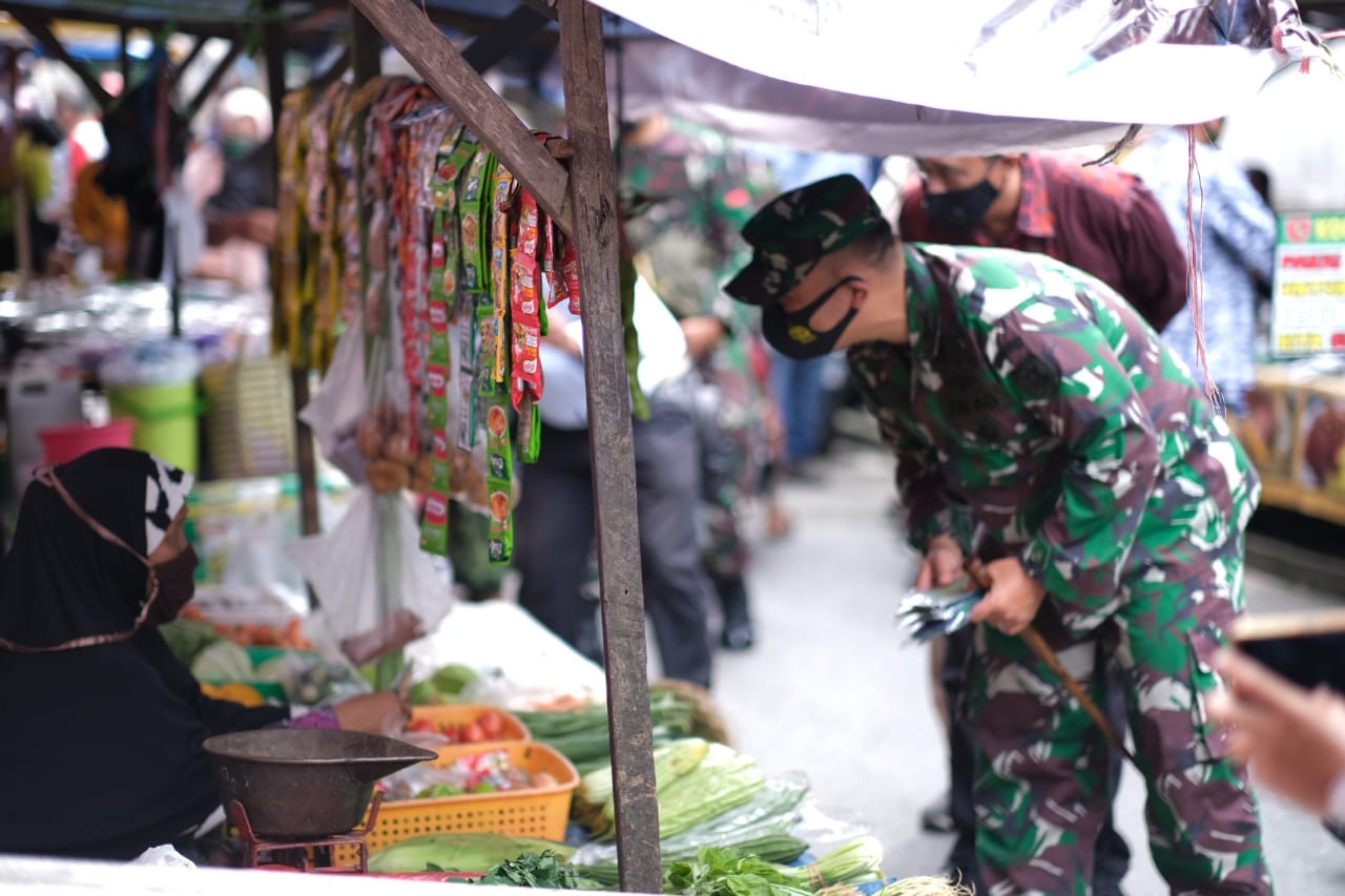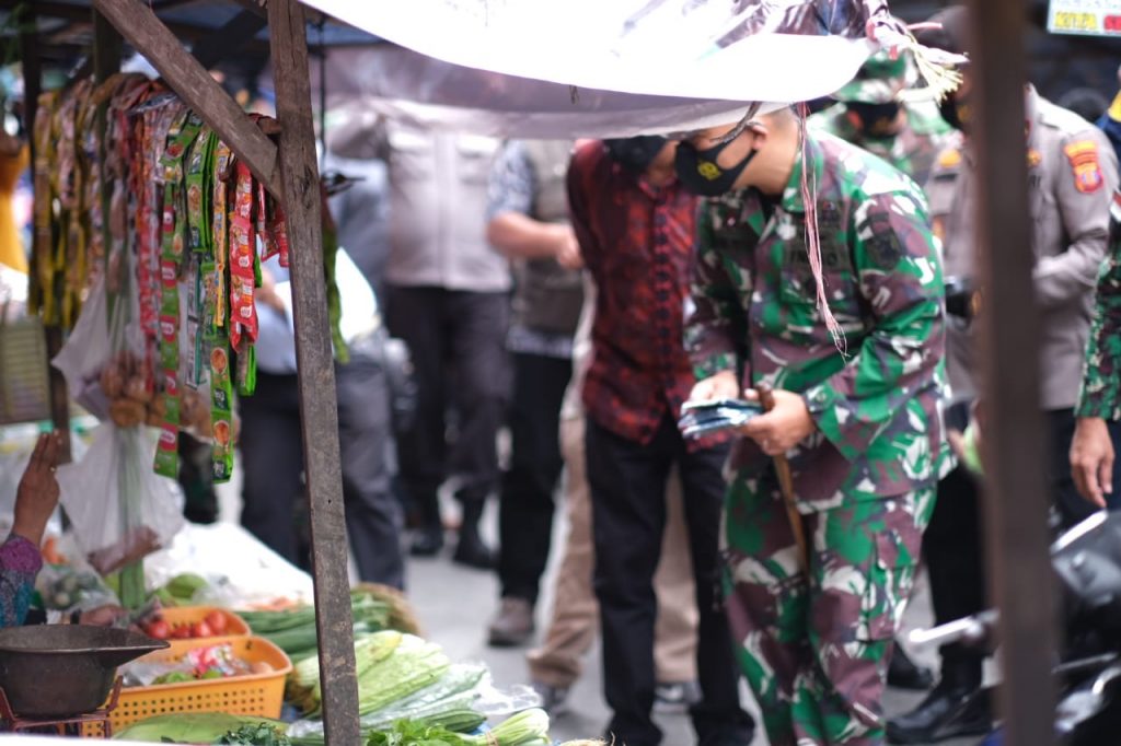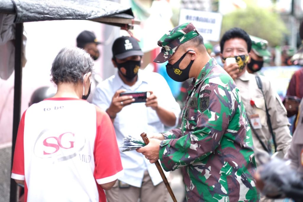 Dandim 0905 Kota Balikpapan Kolonel Arm I Gusti Agung Putu Sujarnawa saat membagikan masker ke pedagang