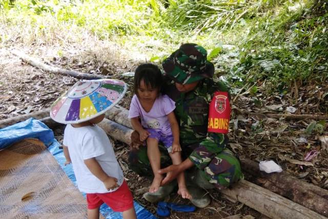 Dengan kedua rekannya yaitu Serda Gilang dan Praka Riyandi dari Batalyon Infantri 614/Rjp Pelda Antopun menemuin ibu Debby tersebut. Dengan senang hati ibu Debby dan kedua anaknya setelah anggota Satgas TMMD mau mampir ke tempat gubuknya.