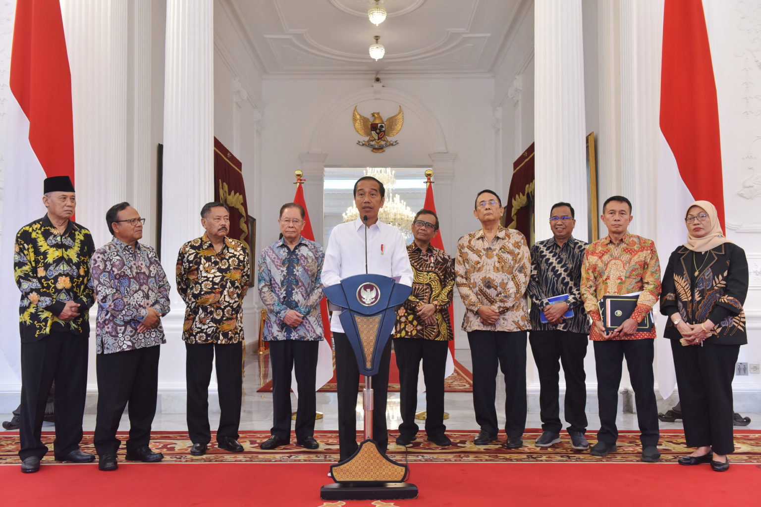 Turut mendampingi Presiden saat memberikan keterangan pers, yaitu Menko Polhukam Mahfud MD dan 8 anggota Tim PPHAM yang terdiri dari Makarim Wibisono, Ifdal Kasim, Suparman Marzuki, Mustafa Abubakar, Rahayu, As ad Said Ali, Kiki Syahnarki, Komarudin Hidayat. (TGH/UN)