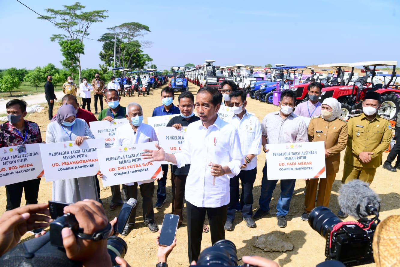 “Saya kira akan banyak sekali daerah-daerah, desa-desa, provinsi, kabupaten akan banyak para petani yang mau beli alat dan mesin pertanian baik itu apa rice mill unit (RMU), baik dryer, baik combine harvester, traktor dan lain-lain dengan pola taksi alsintan,” ujar Presiden.