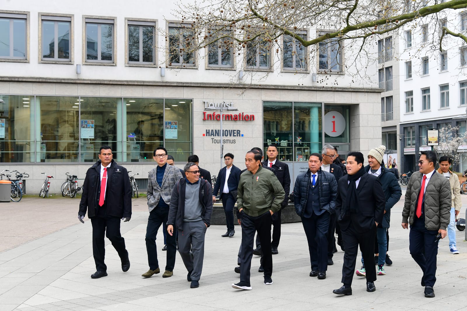 Sekitar pukul 10.40 waktu setempat, Presiden Jokowi tampak berjalan keluar dari hotel didampingi Menteri BUMN Erick Thohir, Menteri Investasi/Kepala BKPM Bahlil Lahadalia, Sekretaris Kabinet Pramono Anung, dan Duta Besar RI untuk Jerman Arif Havas Oegroseno.