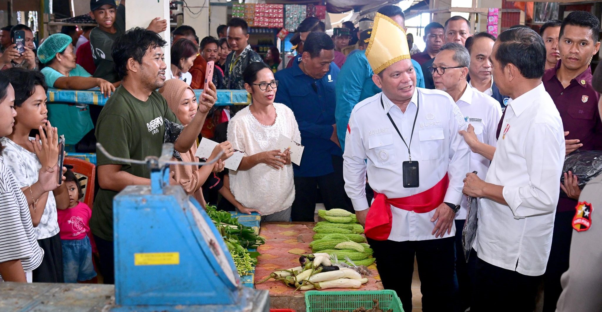 Presiden pun kemudian mengunjungi Pasar Melonguane. Dia berkeliling di area pasar seraya menyapa para pedagang sekaligus mengecek harga sejumlah kebutuhan pokok.