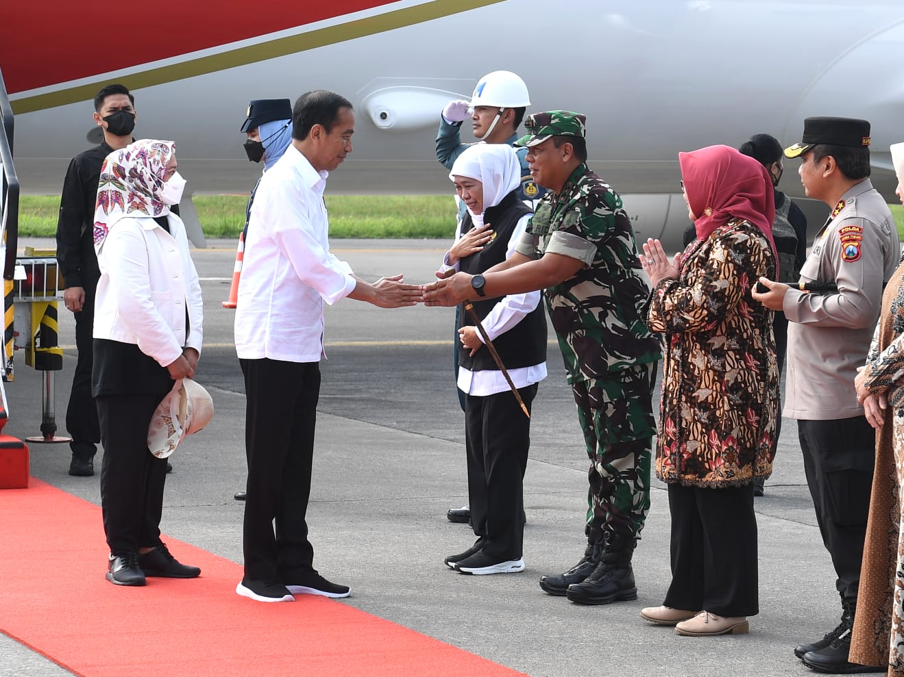 Di Bandara Internasional Juanda, Presiden dan Ibu Iriana disambut oleh Gubernur Jawa Timur Khofifah Indar Parawansa, Pangdam V/Brawijaya Mayjen TNI Farid Makruf beserta istri.