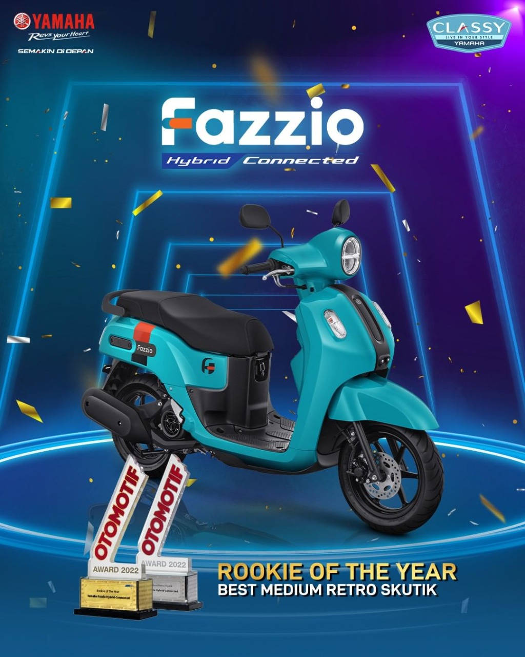 Dari 8 (delapan) penghargaan yang berhasil diraih Yamaha, Yamaha Fazzio Hybrid – Connected sekaligus menyabet 2 (dua) penghargaan sebagai Best of Medium Retro Skutik dan Rookie of The Year 2022