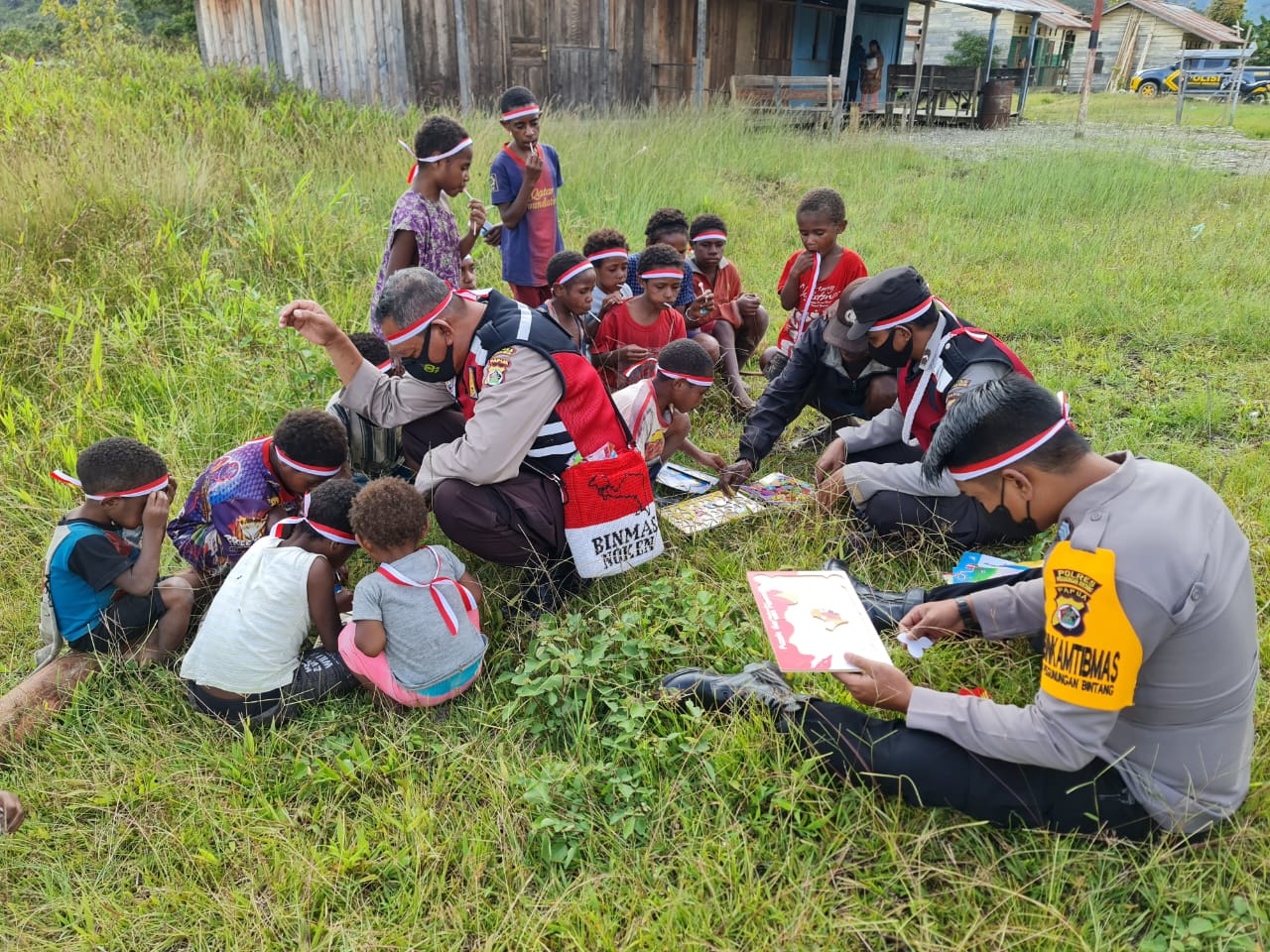 Oksibil – Satgas Binmas Noken Operasi Damai Cartenz 2022 Mengelar Program Kegiatan SI-IPAR, memberikan wawasan kebangsaan dan menanamkan cinta tanah air Sejak Usia Dini kepada anak-anak Kampung Pulbingin, Distrik Serambakon, Kabupaten Pegunungan Bintang, Senin (11/4/2022).