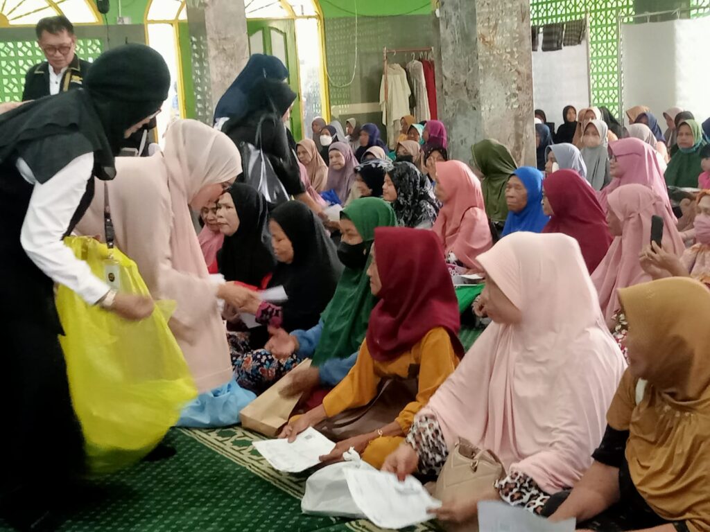 Istri H. Rahmad Mas’ud, Hj. Nurlena mendatangi warga yang menunggu antrian dalam pembagian zakat di dalam masjid Al Falah, Sepinggan, Balikpapan.