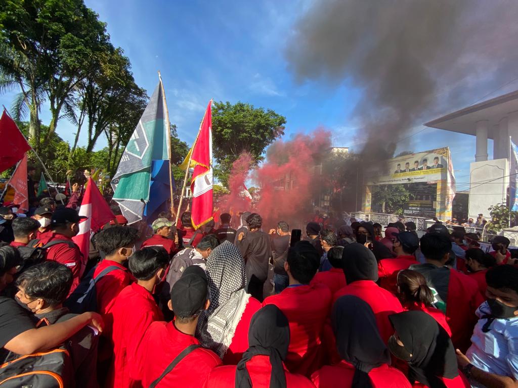 Aksi mahasiswa diwarnai bakar ban sehingga asap hitam menyelimuti lokasi aksi. Demi mahasiswa berakhir pukul 18.10 wita jelang berbuka puas.