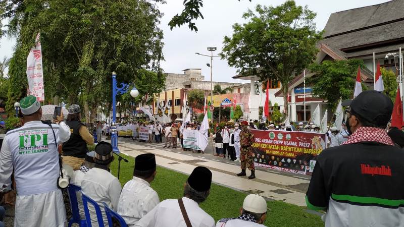 Dalam orasinya, mereka menolak Rancangan Undang-Undang Haluan Ideologi Negara (HIP), yang saat ini masuk dalam Program Legislasi Nasional (Prolegnas). Tampak Ketua MUI Kota Balikpapan KH Hasyim Palenju didampingi Sekretaris MUI Balikpapan Jailani. Aksi diperkirakan diikuti sekitar 600- 700 orang.
