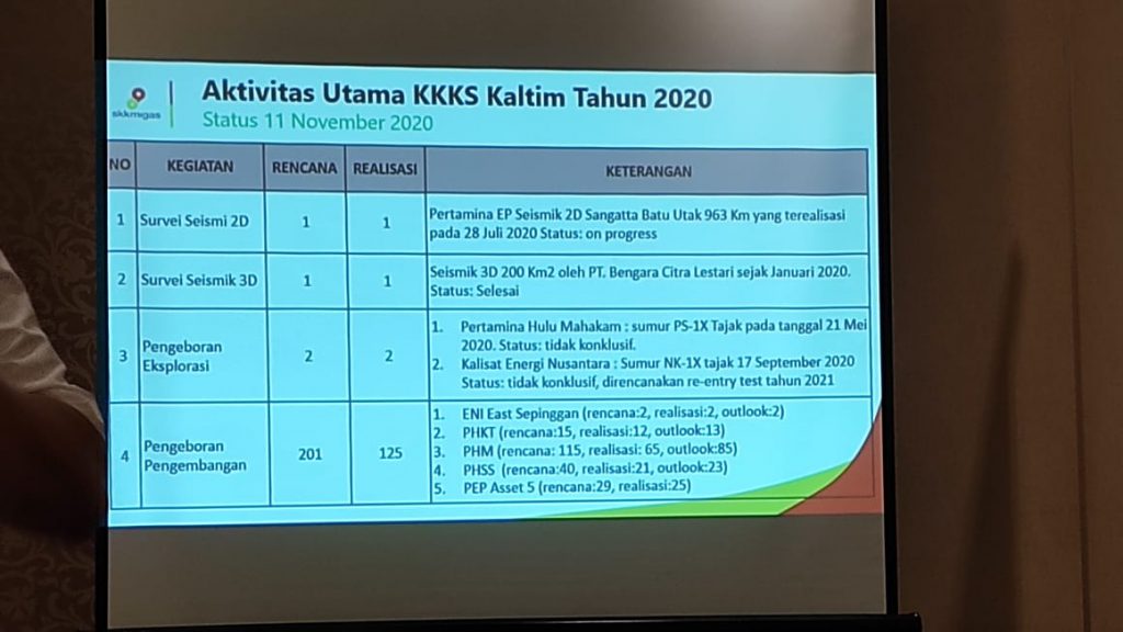 Untuk pengeboran eksplorasi dari rencana 13 sumur terealisasiu 6 sumur atau 75 persen. Untuk pengeboran pengembangan sumur dari rencana 221 sumur terealisasiu 125 sumur atau 57 persen.