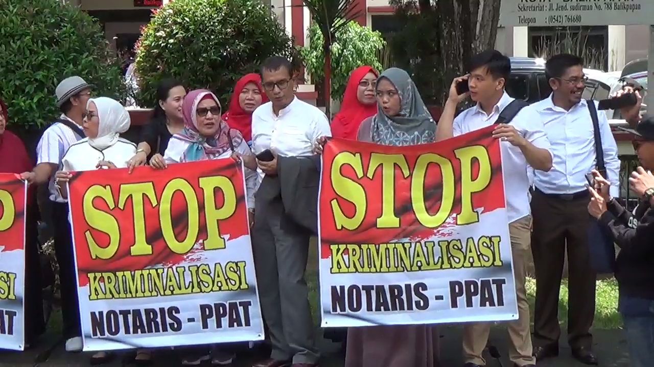BALIKPAPAN, Inibalikpapan – Puluhan notaris Balikpapan melakukan aksi damai di depan pengadilan Negeri Balikpapan, Pengurus Wilayah Kaltim Ikatan Notaris Indonesia. Mereka membawa poster dan spanduk yang bertuliskan “Stop Kriminalisasi Notaris – PPAT” `dan “Hentikan Kriminalisasi Notaris – PPAT”