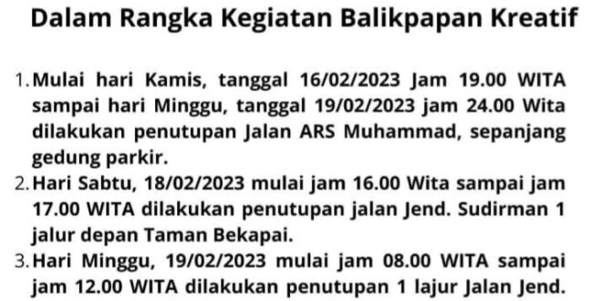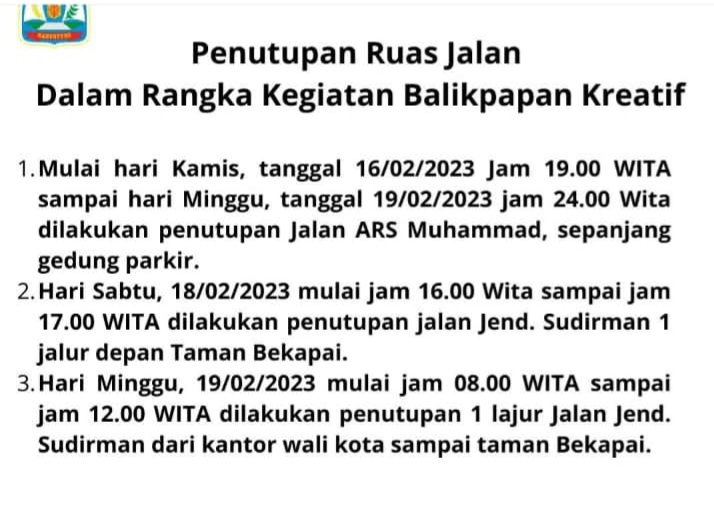 Kemudian Minggu, (19/02/2023) mulai pukul 08.00 Wita sampai pukul 12.00 Wita dilakukan penutupan 1 lajur Jalan Jenderal Sudirman dari kantor Wali Kota Balikpapan sampai taman Bekapai.