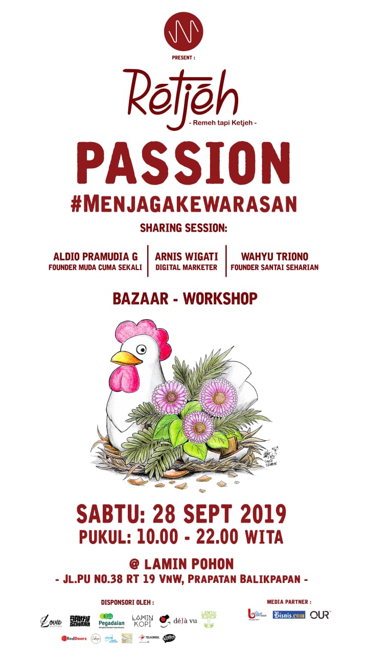 BALIKPAPAN, Inibalikpapan – Rumah Seni Nirmana ruang pembelajaran bersama untuk berkesenian melalui kelas-kelas kreatif, lokakarya, ruang pamer, kolaborasi, diskusi publik, serta agenda kreatif akan menggelar bincang – bincang tentang passion dalam sebuah gelanggang diskusi yang bertajuk Retjeh : Passion #menjagakewarasan.