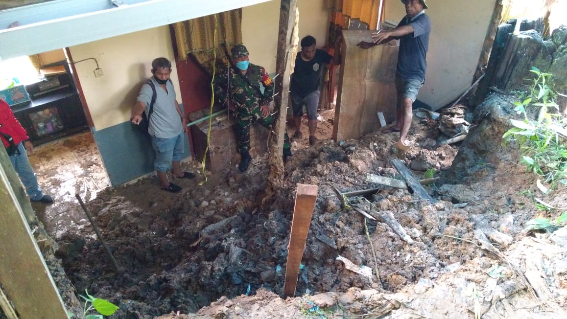 Longsor menimpa rumah, Taman (56) pukul 08.00 wita, Kamis (9/9/2021). Tidak ada korban jiwa namun rumah Taman mengalami kerusakan samping akibat temboknya jebol dan material longsor memenuhi ruangan bagian tengah. Tanah setinggi 3 meter di samping rumah mengalami longsor.