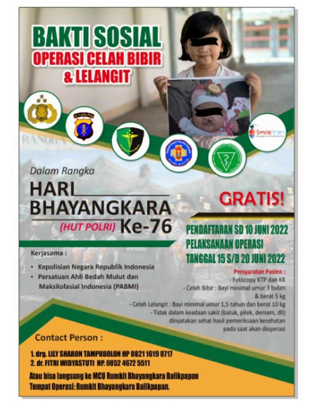 Bakti Sosial tersebut merupakan kerja sama antara Kepolisian Negara Republik Indonesia dengan Persatuan Ahli Bedah Mulut dan Maksilofasial Indonesia (PABMI).