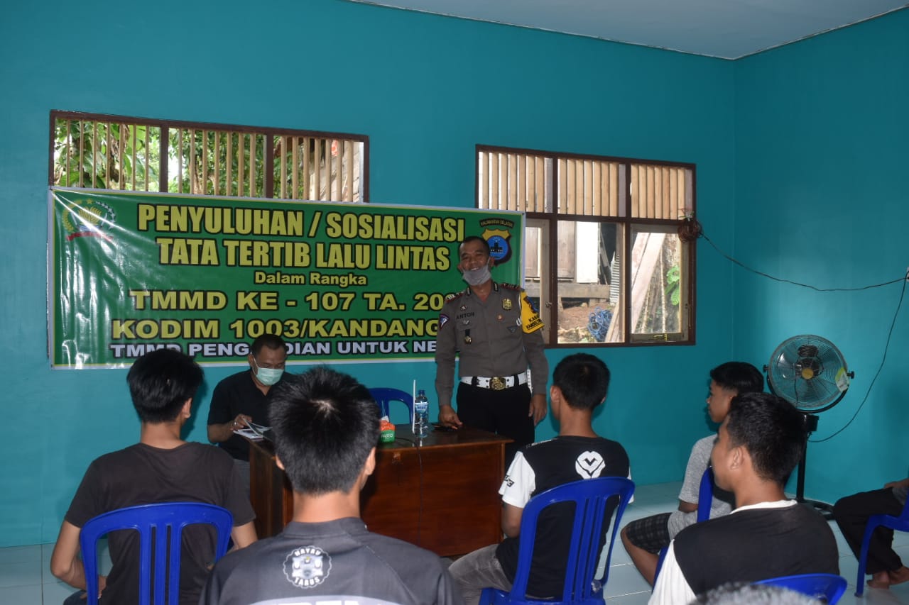 Kali ini satgas TMMD 107 Kodim 1003 Kandangan bekerjasama dengan polres HSS memberikan penyuluhan dan sosialisasi undang-undang tertib berlalulintas kepada warga Kampung Pariangan Desa Batu Bini kecamatan Padang Batung, Hulu Sungai Selatan, Jum’at (10/4/2020).