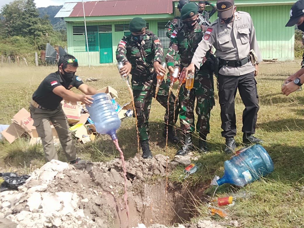 NUNUKAN, Inibalikpapan.com – Sinergitas TNI-Polri bersama Pemerintah Kabupaten Nunukan khususnya kecamatan Krayan Induk melaksanakan pemusnahan barang bukti minuman keras hasil penertiban di wilayah Kecamatan Krayan Induk. Kegiatan ini dilaksanakan di halaman Kantor Kecamatan Krayan Induk, desa Long Bawan, Kabupaten Nunukan, Sabtu (30/1/2021).