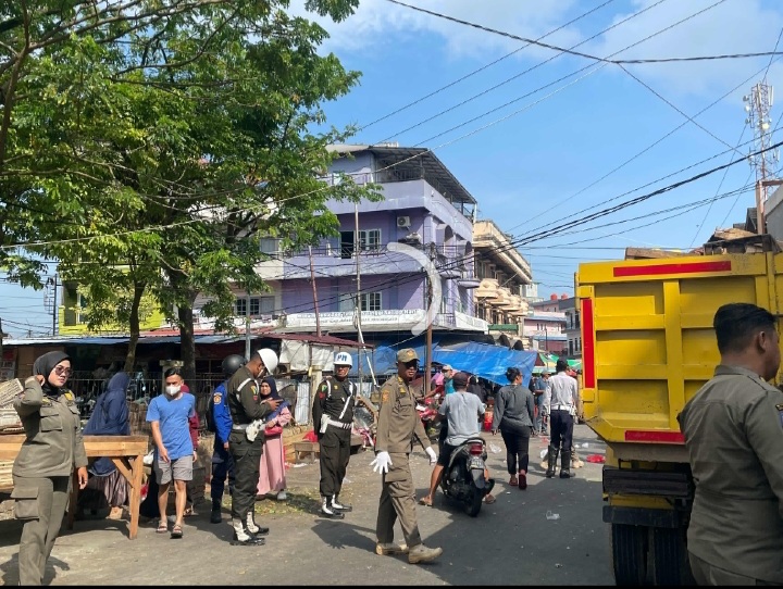 Sejak pagi, belasan personel Satpol PP dan gabungan terlihat menyisir area depan dan samping pasar. Mereka meminta pedagang yang menggelar dagangan di trotoar maupun bahu jalan yang jadi fasum. Untuk segera merapikan barang dagangannya. Tidak sedikit pedagang yang terpaksa menghentikan transaksi dengan pembeli demi menuruti imbauan petugas.