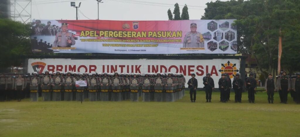 Apel Pergeseran Pasukan Pengamanan TPS dan Personil Penebalan tersebut dipimpin langsung Kapolda Kaltim Irjen Pol Nanang Avianto. Sekaligus pengecekan kesiapan personil yang akan bertugas dalam pengamanan Pemilu 2024.