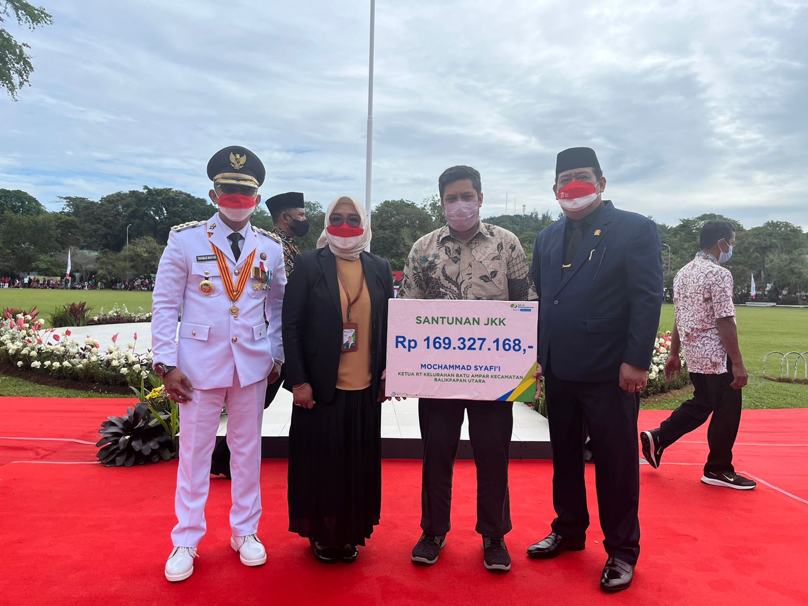 Penyerahan secara simbolis santunan Jaminan Kematian (JKM) tersebut dilaksanakan bertepatan dengan HUT RI Ke -77 di Lapangan Merdeka oleh Wali Kota Balikpapan Rahmad Mas’ud bersama Ketua DPRD Balikpapan. Dalam penyerahan santunan ikut dihadiri Deputi Direktur Wilayah Kalimantan, Rini Suryani.
