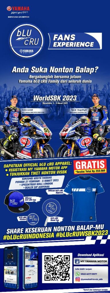 Bagikan momen keseruanmu kepada sesama Yamaha bLU cRU Family dari seluruh penjuru dunia saat nonton balap WSBK maupun saat beraktivitas dengan motor Yamaha dengan hastag #bLUcRUindonesia, #bLUcRUWSBK2023 dan tag akun Instagram Yamaha Indonesia di @yamahaindonesia.
