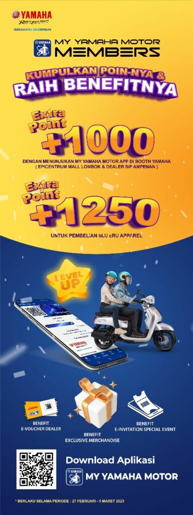 Yamaha, selama sepekan mulai 27 Februari hingga 5 Maret 2023, pecinta Yamaha yang ingin bergabung menjadi Yamaha bLU cRU Family dapat mengunjungi hospitality booth Yamaha bLU cRU yang ada di dealer Yamaha SIP Ampenan Mataram dan Lombok Epicentrum Mall Mataram. Mereka akana mendapatkan Bonus Extra Point di My Yamaha Motor Member, serta Official Apparel Yamaha bLU cRU secara GRATIS.