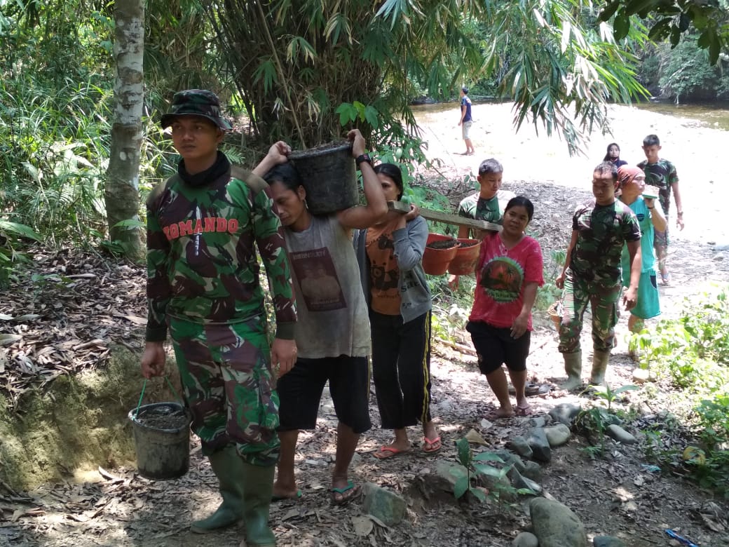 Seluruh warga dari usia muda hingga orang tua bahu membahu bersama TNI, turun kesungai mengambil batu dan pasir yang tersedia banyak disepanjang sungai yang menjadi tempat warga mengambil kebutuhan air setiap hari.