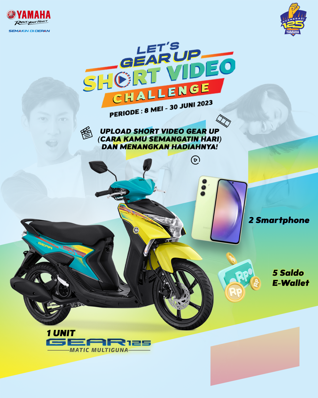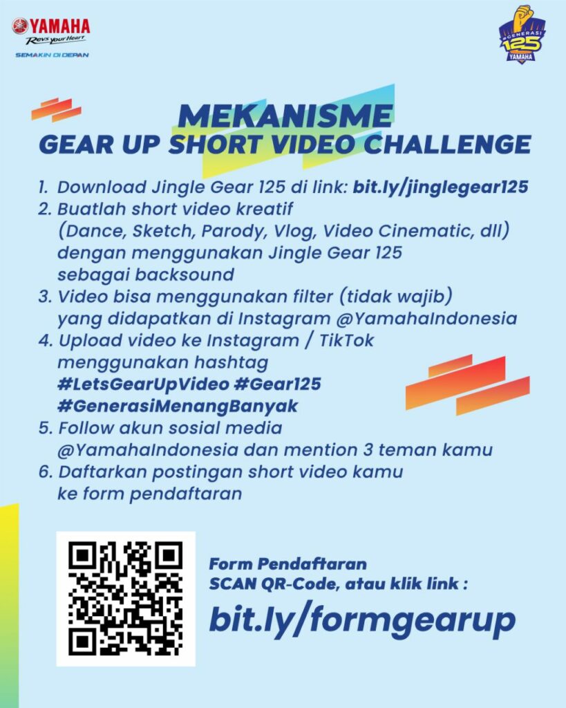 Dengan semangat untuk selalu Let’s Gear Up, Yamaha mengajak para generasi muda yang memiliki kreativitas tinggi untuk mengikuti Let’s Gear Up Short Video Challenge mulai tanggal 8 Mei – 30 Juni 2023.