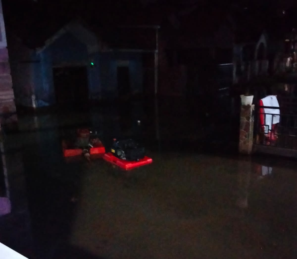 “Rumah saya di Jalan Cisadane Blok A RT 52 no A 01. Tadinnya tinggi selutut sekarang sudah mulai berkurang. Turun 20 centi setelah disedot BPBD. Ada 9 apa 10 truk tanki pagi sampai sore. Sekarang (Malam) lagi disedot pakai alkon untuk dorong air ke aliran drainase ke arah bozem perumahan daun vilage,” terang Yayuk, Senin (26/6/2023).