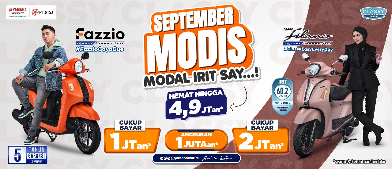 “Ya. Yamaha Kaltim sudah menyiapkan promo September Modis alias Modal Irit Say. Promo ini merupakan cara mudah buat kalian yang sudah mengimpikan untuk bisa menunggangi motor baru khususnya Yamaha Fazzio atau Yamaha Filano,” ungkap Asisten Manajer PT. STSJ Kaltim, Efendy Ariadi.