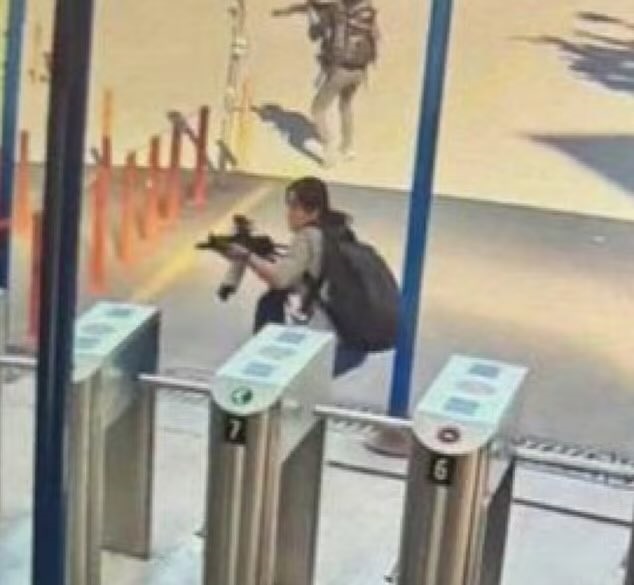 Penyiar menunjukkan gambar gerbang yang rusak dan rekaman baku tembak di tempat parkir. Terlihat juga dua penyerang yang membawa senapan serbu dan ransel saat mereka memasuki gedung.
