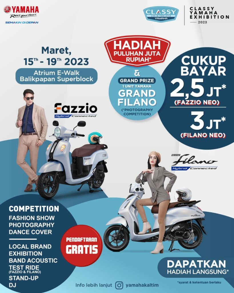 Karena itu untuk lebih dekat dengan konsumen, Yamaha menggelar event spekatkuler Classy Yamaha bertajuk Classy Yamaha Exhibition 2023. Event ini akan berlangsung di atrium e-Walk, Balikpapan Superblock (BSB), pada 15-19 Maret 2023 mendatang.
