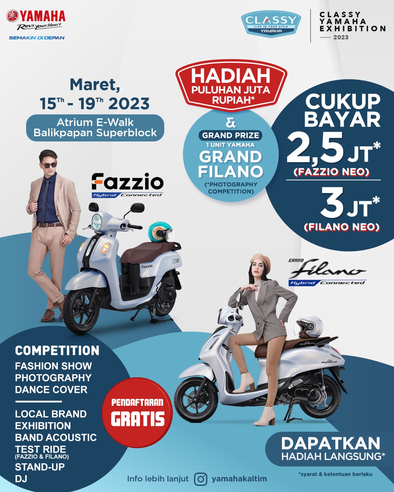 Selain menikmati pameran dan test ride, pengunjung juga dapat menikmati berbagai acara menarik, serta berkesempatan membawa pulang hadiah dengan total puluhan juta rupiah dan 1 unit Grand Filano Hybrid-Connected dengan mengikuti kompetisi, foto competition, fashion show bersama produk Classy Yamaha, serta kompetisi lainnya.