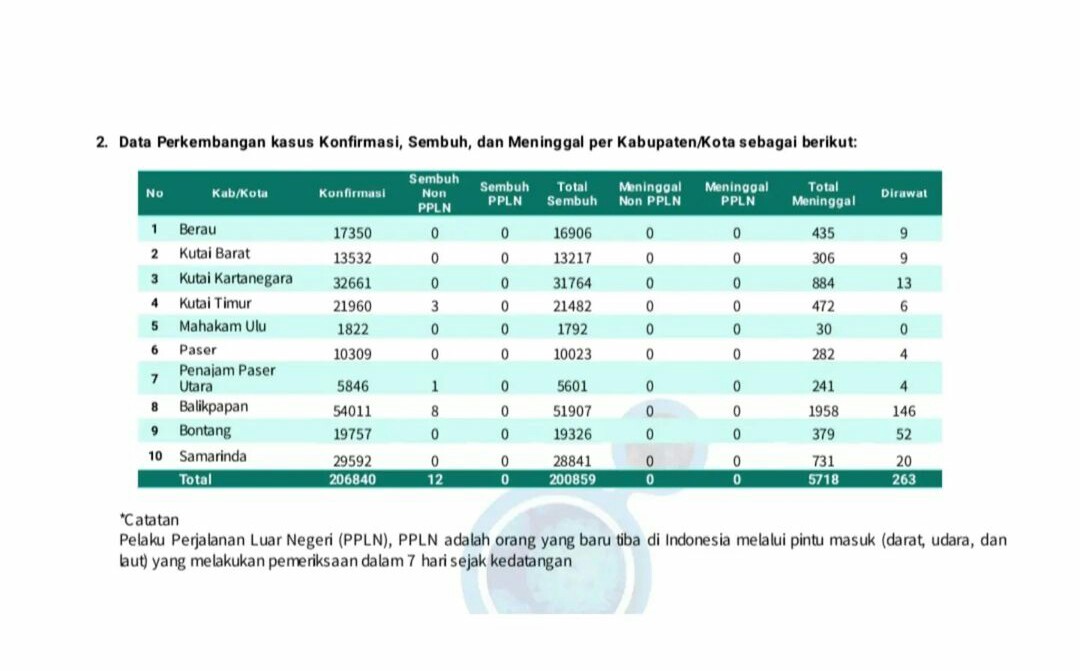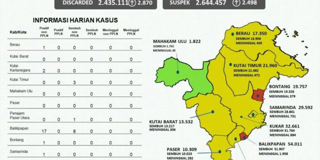 Lalu Kabupaten Kutai Timur (Kutim) dengan 6 kasus aktif. Penajam Paser Utara (PPU) dan Paser sama-sama 4 kasus aktif. Sedangkan Kabupaten Mahakam Ulu nol kasus aktif, sehingga zona hijau.